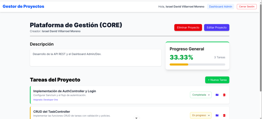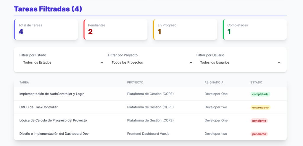- Advanced Data Filtering & State Management: As shown in the developer dashboard below, the frontend efficiently handles complex data states, allowing users to filter extensive task lists dynamically by status, project, and assignee without querying the server for every UI update.