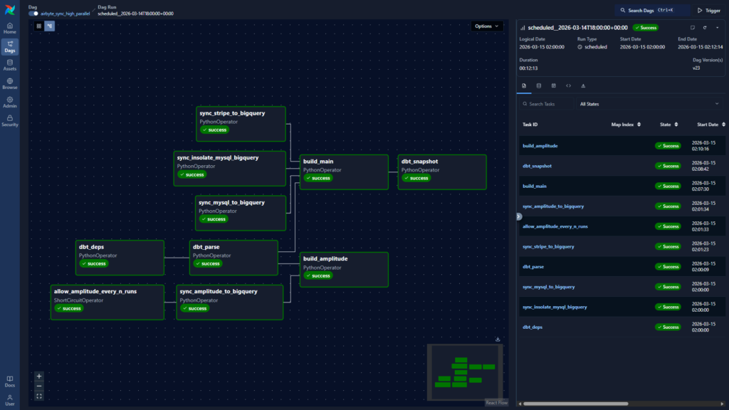- Integrated Ecosystem: Airflow was configured to orchestrate everything from our ingestion tools to our transformation layer, tying disparate systems together into a unified workflow.
