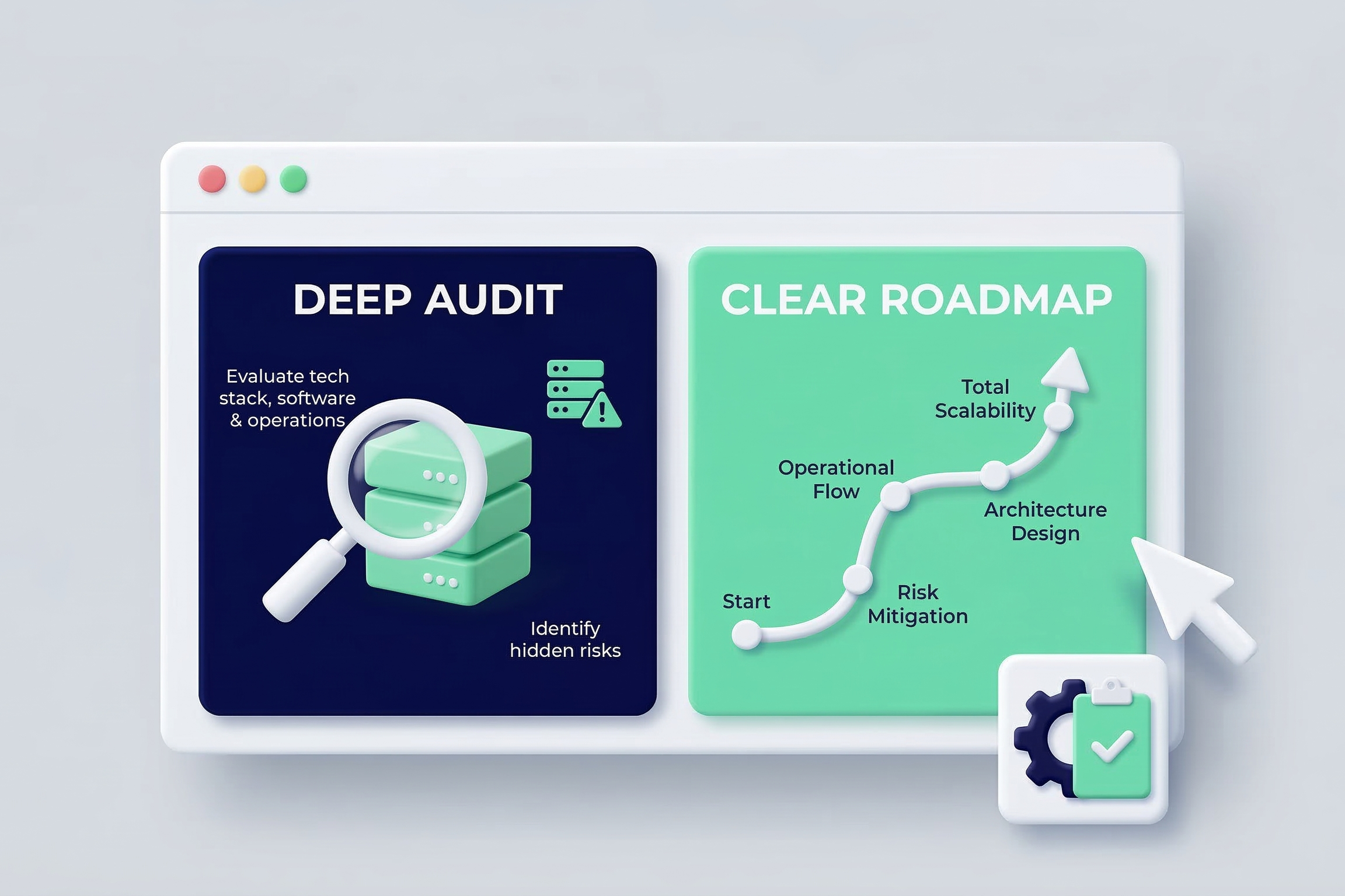 We evaluate your entire technical infrastructure, software, and daily operations first. This structured diagnostic allows us to identify hidden risks and operational bottlenecks before executing any major changes. We provide a clear architectural roadmap for total scalability.